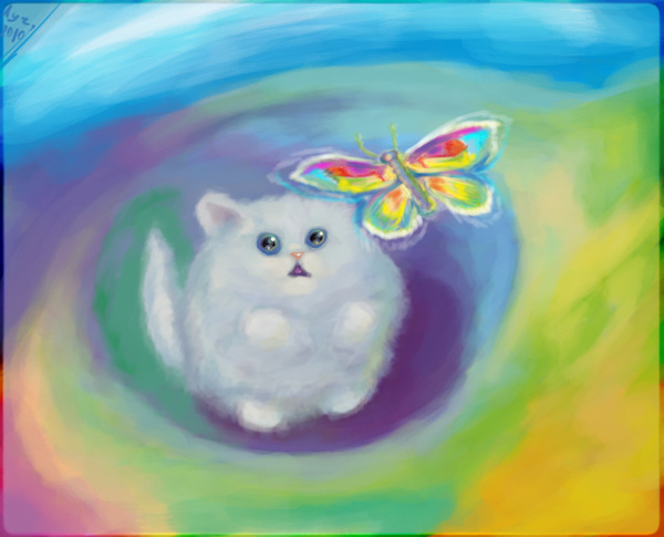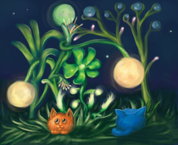 А придумал он вот что: надо ушки спрятать под листочками, а хвостик — под большим светящимся цветком. Вы скажете — эка невидаль, так ведь каждый кисёнок прячется — но на то наш пушистый герой и изобретатель, что он кое-что новое в эту замечательную традицию привнёс. Понял пушистик вот какую проблему: когда ходишь по лесу, за тобой цветы не поспевают, даже если им очень хочется твои ушки от дождя защитить. Медленно ходят. И поэтому легче кисятам попрятаться по домикам, дождь пережидать. А то и вовсе к сове в дупло забраться — но ненадолго, а то она за хвост клюнет!