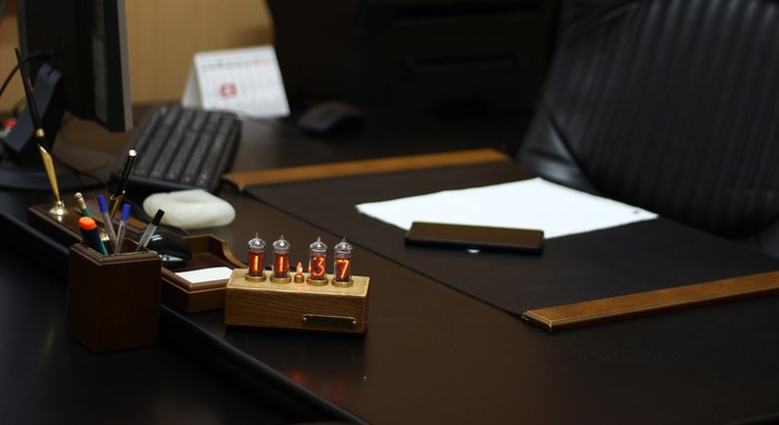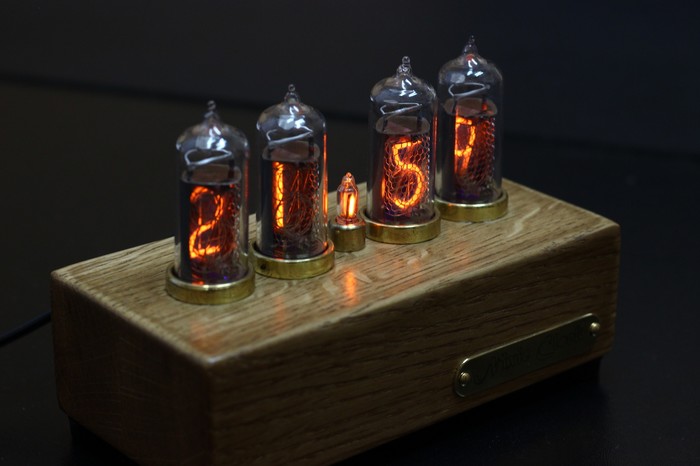 часы на газоразрядных индикаторах ИН-14 в корпусе из дуба и латунными элементами украшения.