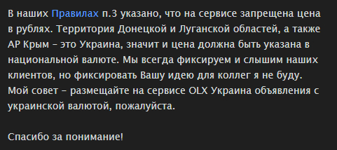 Есть такой сервис- доска объявлений, как OLX, аналог Авито. Пользовался им с незапамятных времён, затем, с приходом 2014го года, как житель Донецка, стал указывать в описании объявления актуальную цену в рублях. Указать данную валюту в соответствующей графе не было технической возможности, ну и не сильно то и хотелось.