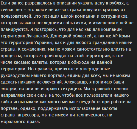 И тут с приходом февральских событий что-то переключилось в голове у руководства данного сервиса, так как мои объявления стали активно удалятся с пометкой "некорректная цена". Немного изучив вопрос, наткнулся на интересные стркои в правилах, появившиеся недавно, собственно их мне в техподдержке и процитировали, но уже на русском, когда я обратился с вопросом, какого собсна говоря...