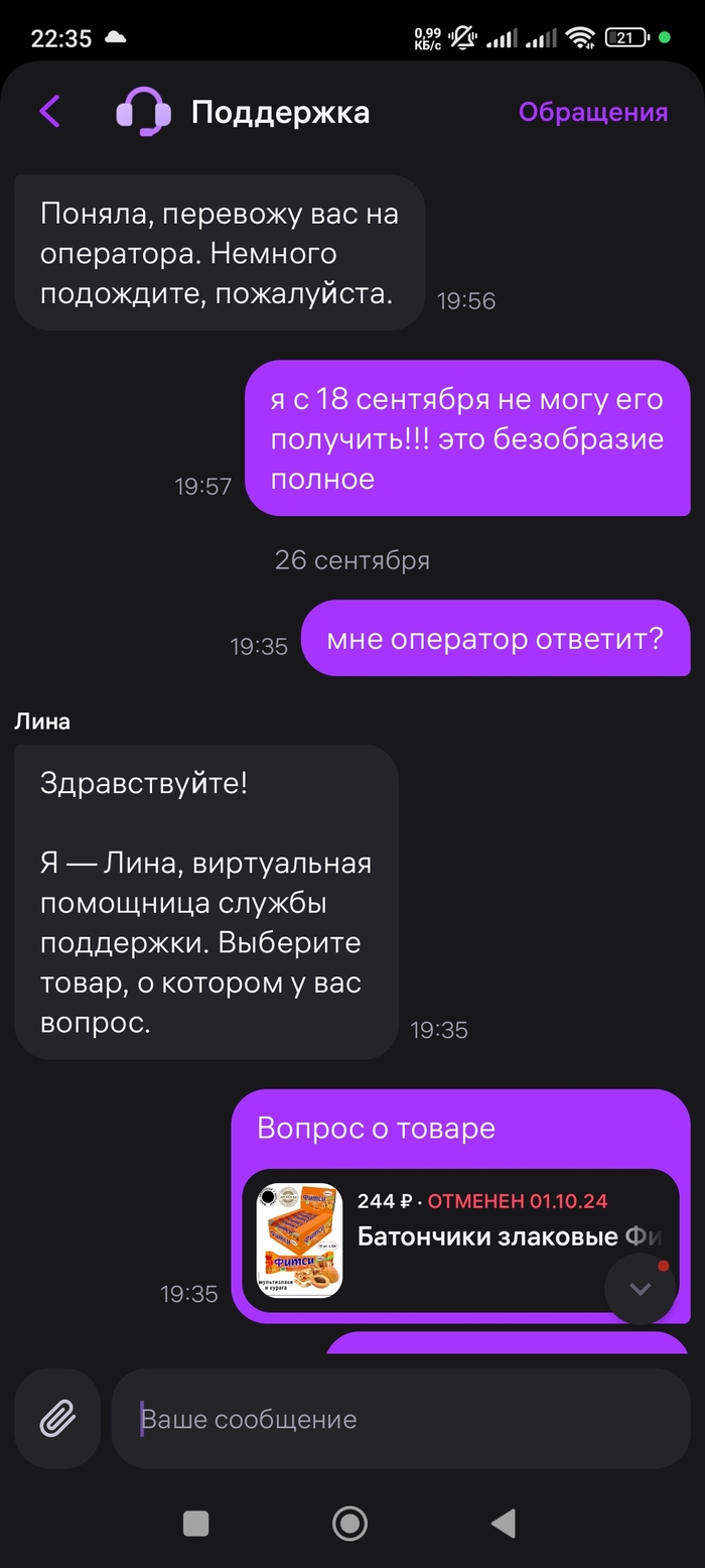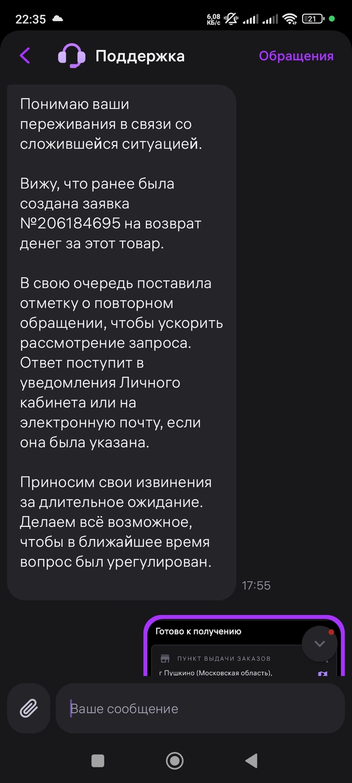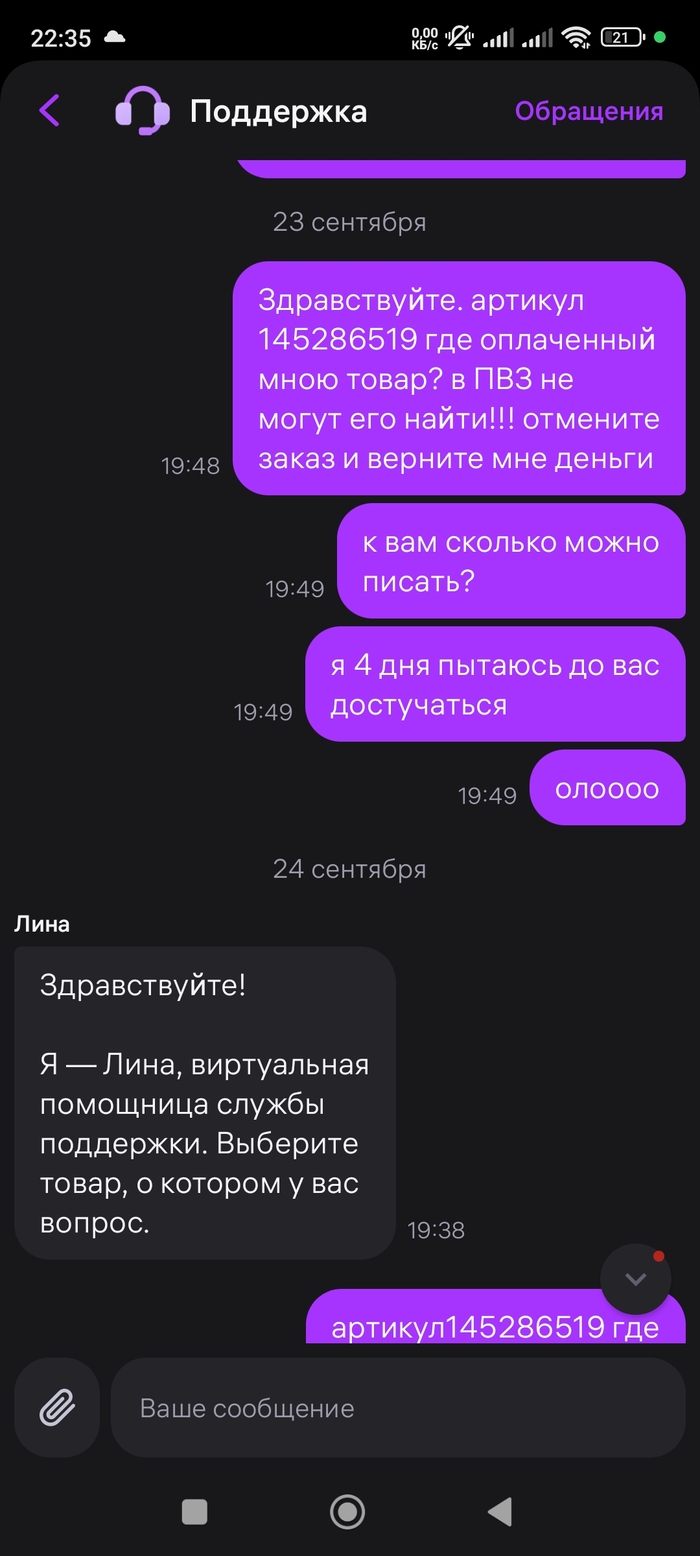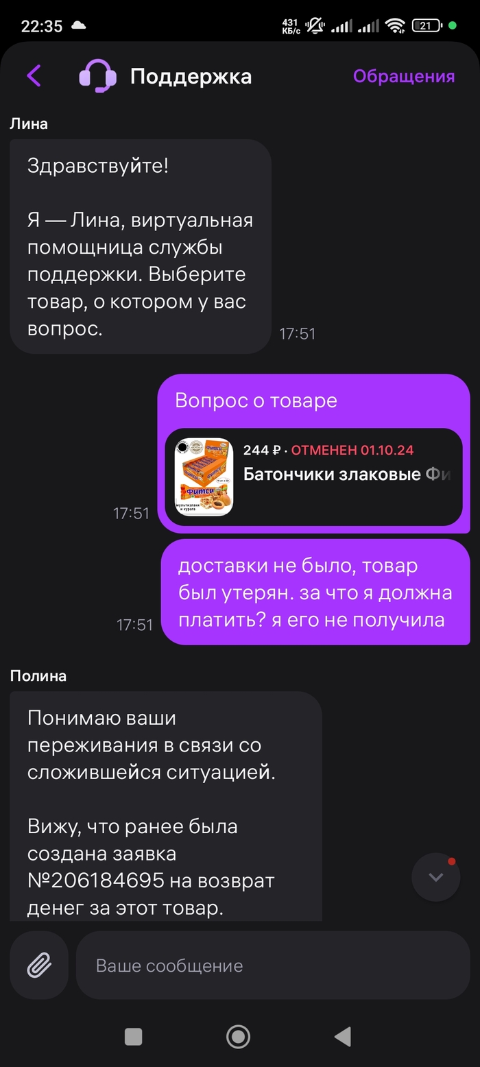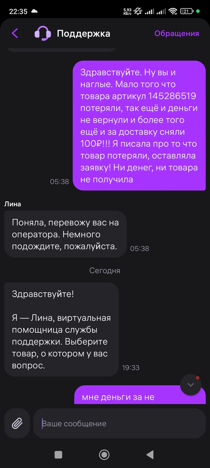Оплатила товар 250₽ не дорогой, в ПВЗ его потеряли, так его и не получила, оформила "потерю товара", через пару дней переписки (отвечают оооочень долго) списали бабки за обратную доставку, при этом ответ пришёл " Утилизация" Что они курят, прошу поделиться, молчат... 😆😁 Не большая часть переписки Ребзя 😅 ток момент, они с меня сняли 100₽ за тот товар который был утерян, и эта сотка была потрачена за возврат товара, который я так и не получила в ПВЗ!!! 😁 , @Wildberries.ru, Вы конечно МОЩЬ!!!! 😁😁😁