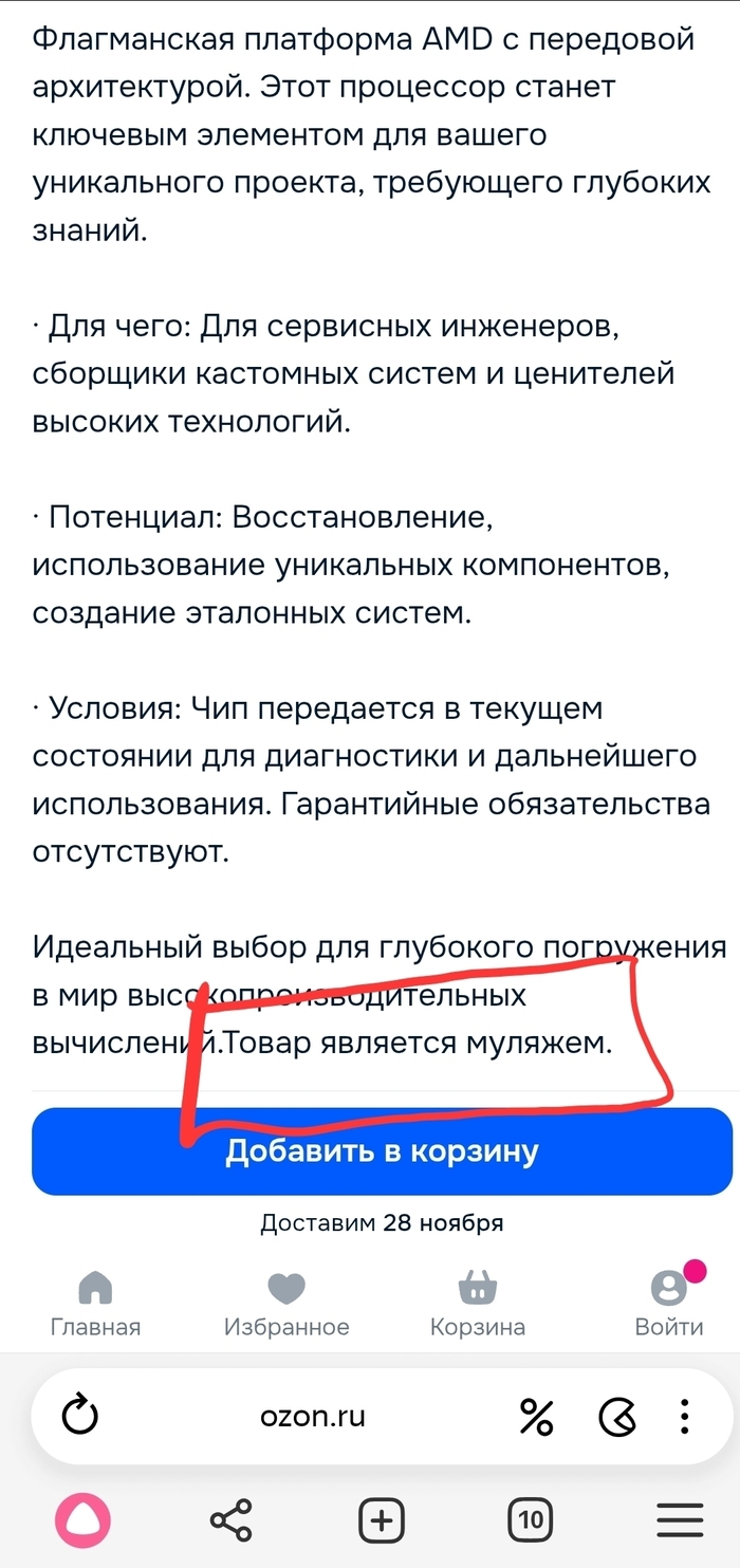 Товарищ Rendz решил посмотреть комплектующие для ПК на OZON и столкнулся с процессором AMD Ryzen 7 9800X3D по удивительно низкой цене. Но был нюанс: в самом конце описания продавец скромненько указал "Товар является муляжем".