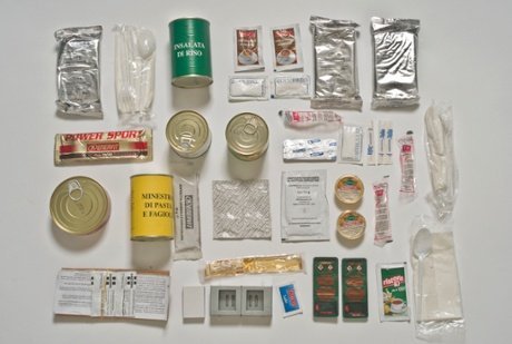Помимо всего прочего, в итальянский сухпаек входят: 50 мл 40%-го алкогольного напитка и одноразовая печка для подогрева еды. А также: неизбежная паста, фасолевый суп, порошковый кофе со взбитыми сливками, консервы из индейки, салат с рисом, консервированный фруктовый салат или шоколадные мюсли.