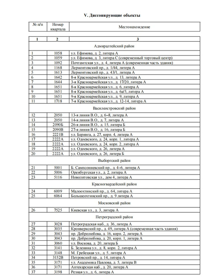 Кроме того, в проекте сохраняется список диссонирующих объектов — это здания, построенные позднее 1917 года, которые не соответствуют режимам зон охраны ни по архитектурному решению, ни по параметрам, либо нарушают требования к градрегламентам или портят визуальное восприятие объектов культурного наследия, панорам и видов. В действующей редакции 75 объектов, в предложенной — 71 объект.