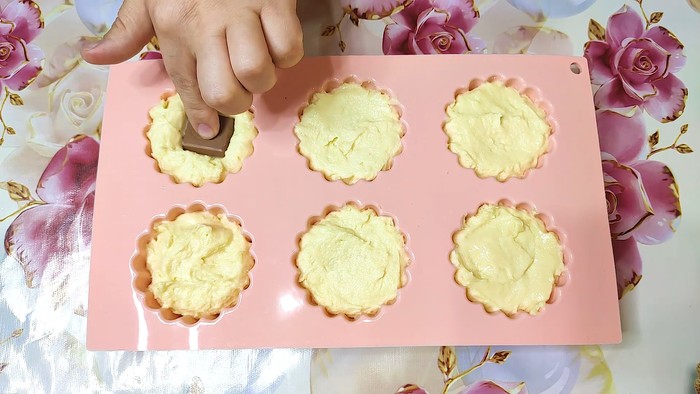 Любую форму смазываем растительным масло, выкладываем тесто по одной столовой ложке, в центр по желанию прячем шоколадку, сверху закрываем тестом.