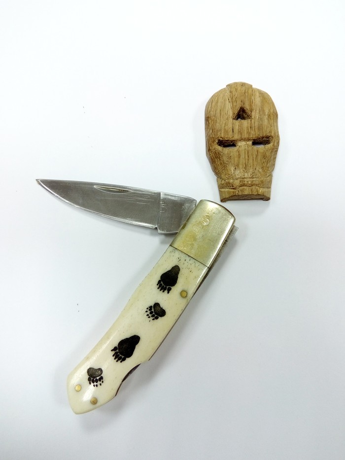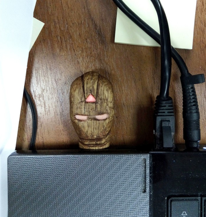 Далее выбрал резцами и стамесками гнездо под флешку и склейка (на эпоксидку). Глаза и отверстие на лбу тоже залито эпоксидкой.