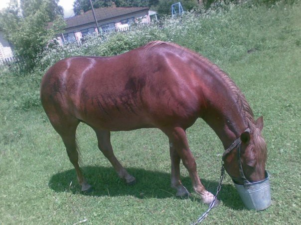 Папа посадил меня на нее ещё с дошкольного возраста и все... Я влюбилась в эти покатушки. Каждый день вечером я ходила с ним на поле ее забирать и возвращалась верхом. Малина у нас девушка интересная была, ухаживание принимала только от одного жеребца Буяна -- красивый вороной конь с белыми копытами и "звездой" во лбу. В одно из таких ухаживаний я пострадала, но мои страдания были не напрасны))) во время брачных игр они (Малина и Буян) порвали цепи, на которых их оставляли на пастбище и гарцевал по школьному саду, а я пошла ее забирать. Мелкая совсем, не успела увернуться и схлопотала копытом в бедро -- кровищи было мама не горюй, да и нога онемела так, что шевелить ею не могла. Короче, сама виновата, надо было помнить предостережения отца и вообще его подождать. Хорошо отец был рядом и быстро меня оттуда унес. Какие проклятия я тогда на нее сыпала, до сих пор мои их вспоминают и смеются))) и Геракла я там приплела, и как он ее накажет за меня во всех красках описала... мультиков, видимо, накануне пересмотрела. Шрам от того урока остался до сих пор) но как уже описала, страдания мои оказались не напрасными. Через некоторое время на свет появилась моя любимая подруга и кошмар к для окружающих -- имя ей дали Ласточка.