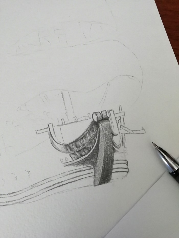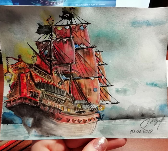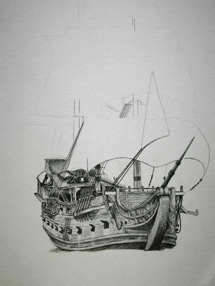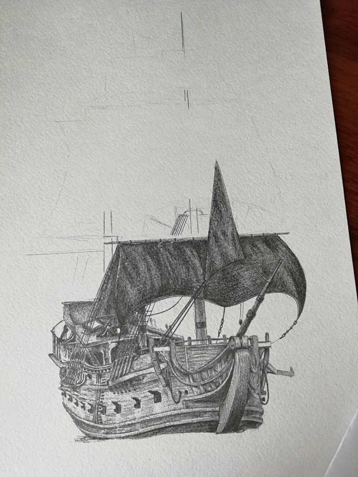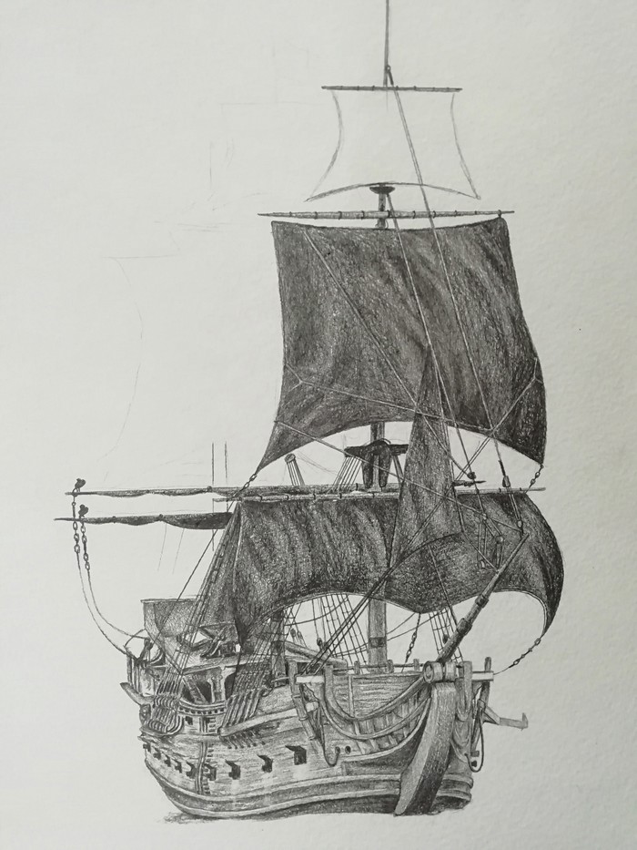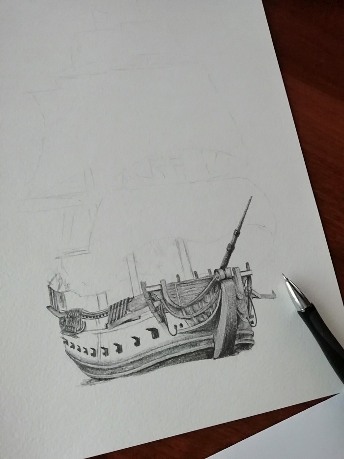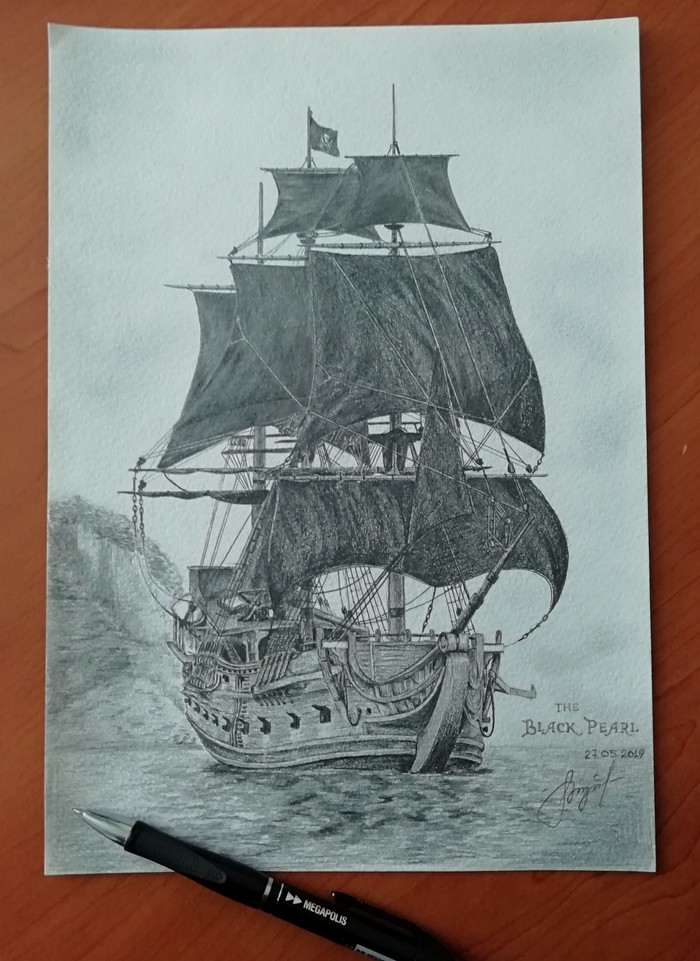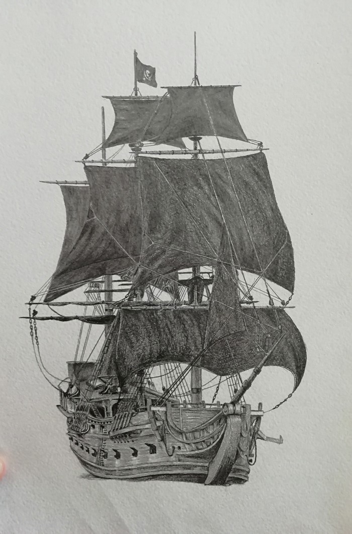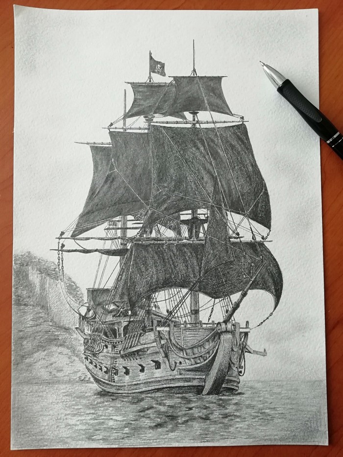 Хочу поделиться своим вторым кораблём))) Я очень люблю корабли и все части "Пиратов Карибского моря". Первым кораблём в технике акварель был корабль Чёрной Бороды. Но особую любовь вызывала "Жемчужина". Как только пришло вдохновение, решила нарисовать в графике (были мысли затонировать и тени увести в синий, но потом отказалась от идеи). Рисовала на акварельной бумаге, потому что понравилась текстура. Рисовала механическим карандашом.