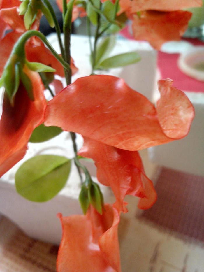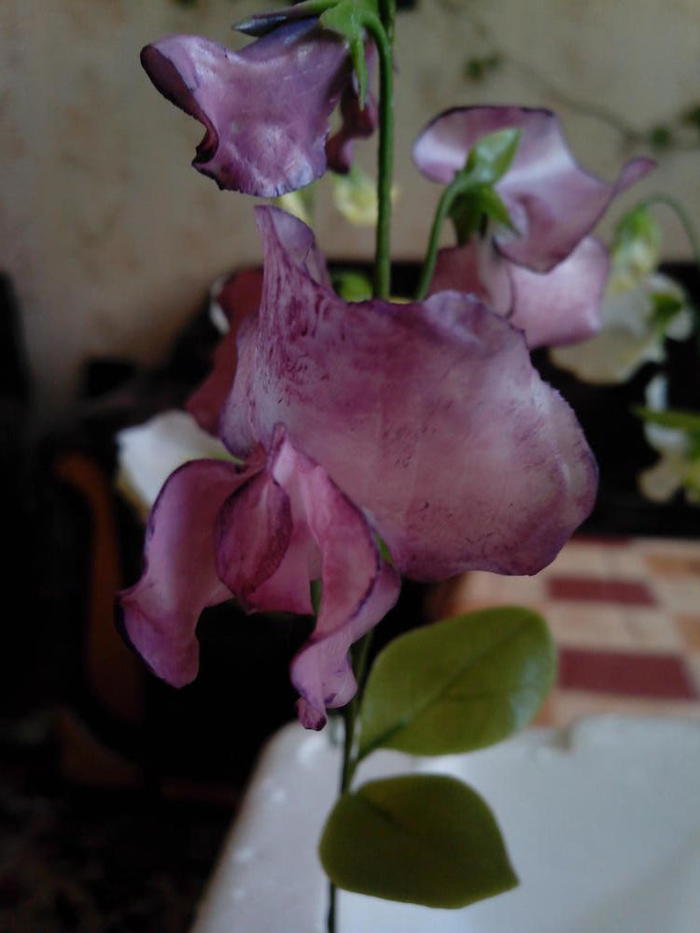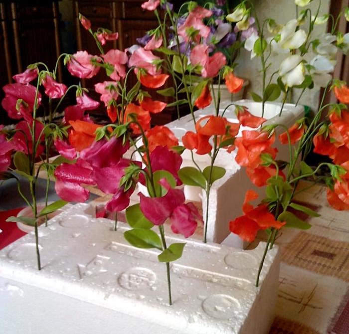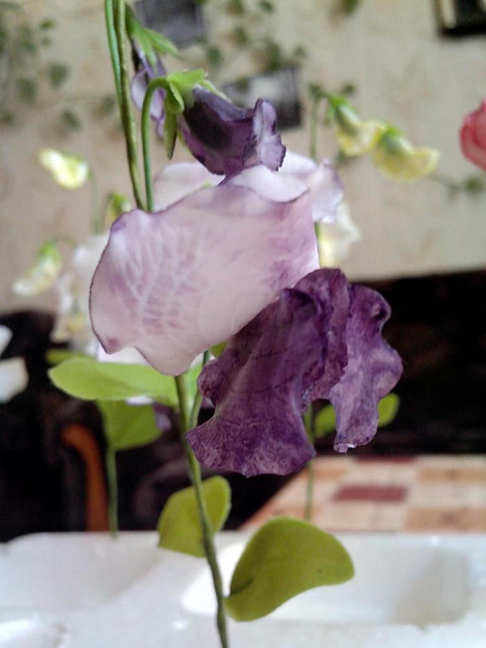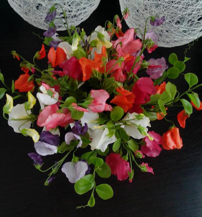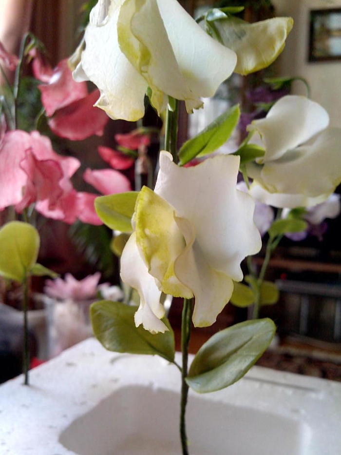 Работа сделана из холодного фарфора. Каждый цветок, бутончик, листик слеплен вручную. Не использовала молды и катеры. Дополнен букет несколькими веточками мускари.