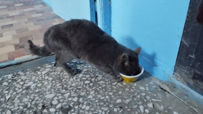 Взяв бродягу на руки, я понесла его в свой подъезд. Кот мяукал то ли возмущённо, то ли с вопросительной интонацией. Рядом с лестницей, у нас есть площадка с батареей, где можно спокойно всё обдумать. Там я и провела следующие полчаса в поисках его дома. Дала мягкий корм из пакетика, совсем чуть-чуть, чтобы не стало плохо от переедания с голодухи. Бедняга стал так жадно глотать и трястись, что я утвердилась в правильности своего поступка. В этот момент я сделала фотографию: