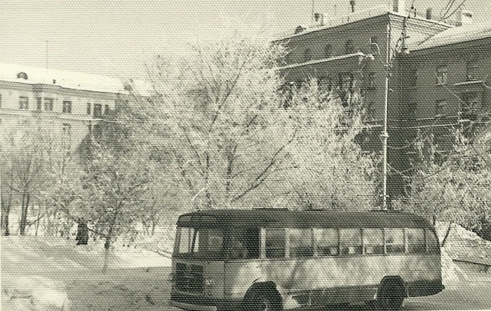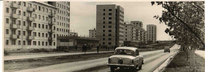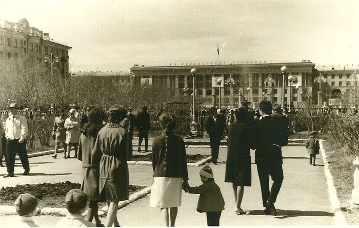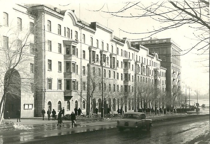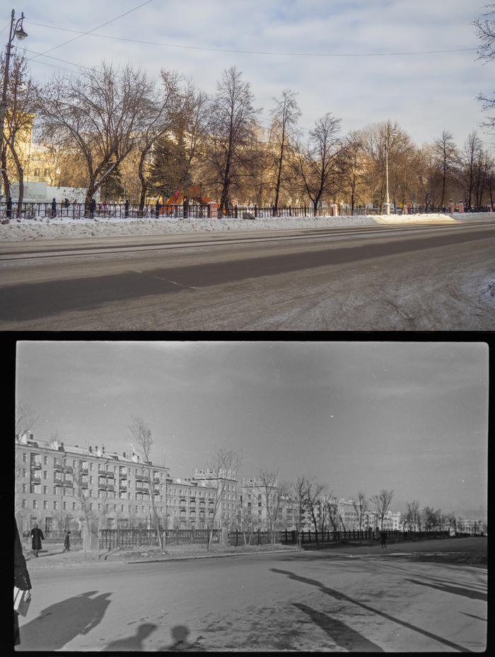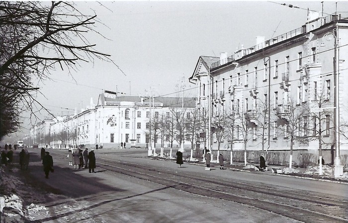 А это уже любимый многими горожанами тогда и сегодня сквер на проспекте Металлургов. На фото 50-х годов деревья еще молодые, а потому можно разглядеть дом напротив. Сегодня даже без листвы зеленые насаждения скрывают от нас и сам сквер и дома.