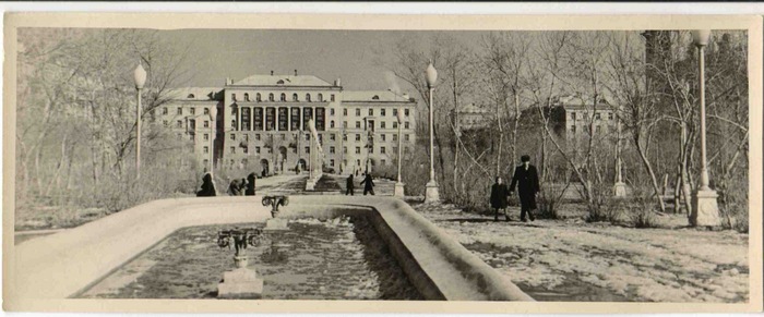 Возвращаемся к МГТУ им. Носова. Строительство этого здания началось в 1956 году и было признано «ударной комсомольской стройкой». Полностью возвести здание удалось к 1961 году. До этого же времени местные мальчишки постигали азы уличной жизни на строительной площадке института, а жители могли видеть дома частного сектора в поселке Крылова.