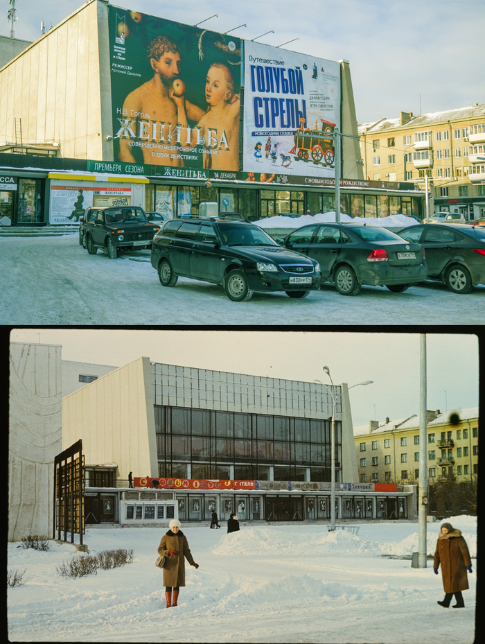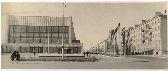 А это уже Драматический театр имени Пушкина, расположившийся на другой стороне проспекта Ленина. В это здание театр переехал в 1967 году. И в то время это было современное архитектурное сооружение, построенное к 50-ой годовщине Октябрьской Революции. Первой пьесой, показанной на новой сцене была постановка «На дне», которая шла одновременно и в Ленинграде.