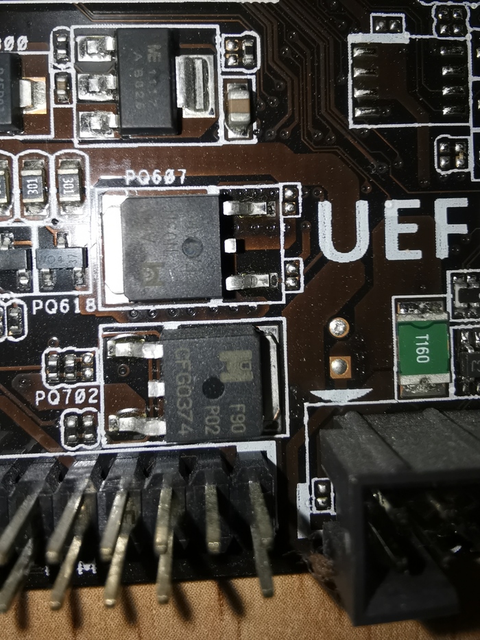 В общем, это недоразумение папа поправил, вот только ещё оказалось что закоротило Р образный транзистор, кажется это так называется, я весь инет облазил в поисках нужного, но увы, без результата. Отсюда просьба, если есть кто в этом разбирается или знает где можно достать нужный транзистор или подходящий аналог в Петербурге, был бы очень благодарен. Не жмот, но жалко выкидывать 5-6к рублей за б/у материнку 1150 сокета, а мою вроде как можно подлатать. Денег на все новое нету, понятно что самый простой вариант купить новую мат плату, проц и оперативку, но пока лишних нету. Фото необходимого транзистора (F90 P02):