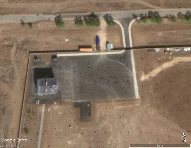 У северного забора с запада расположено единственное сооружение — двухэтажное здание с большой парковкой и двумя въездными воротами.