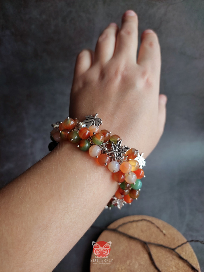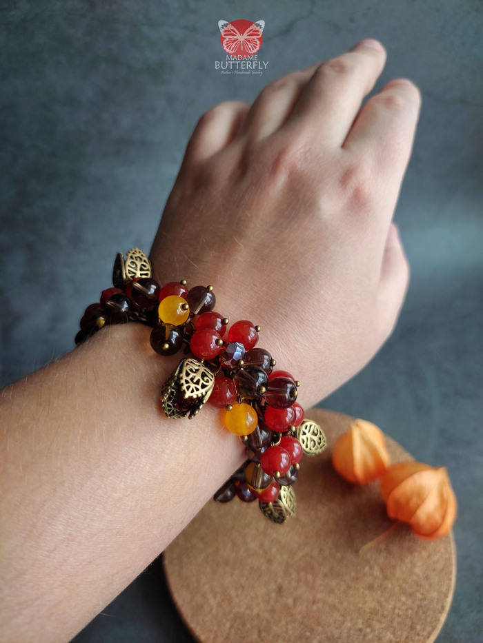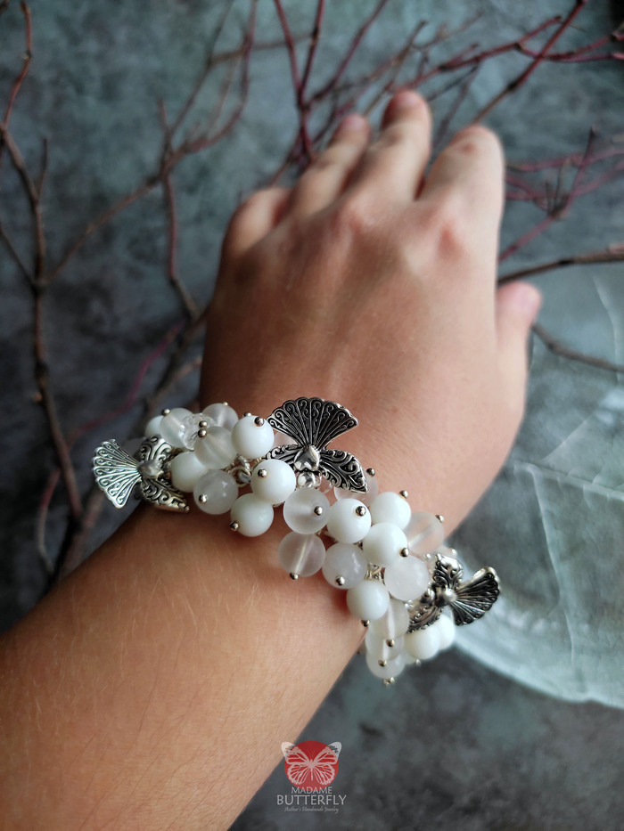 Из материалов хорошо сгармонировали бусины кварца, лунного камня, тридакны, а также гранёные бусины из чистого стекла.
