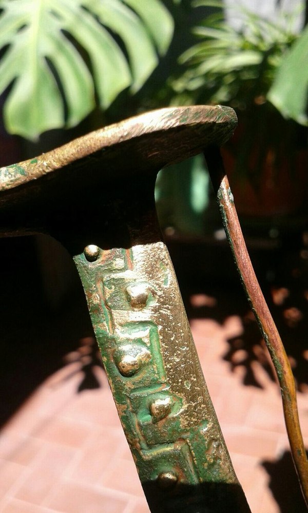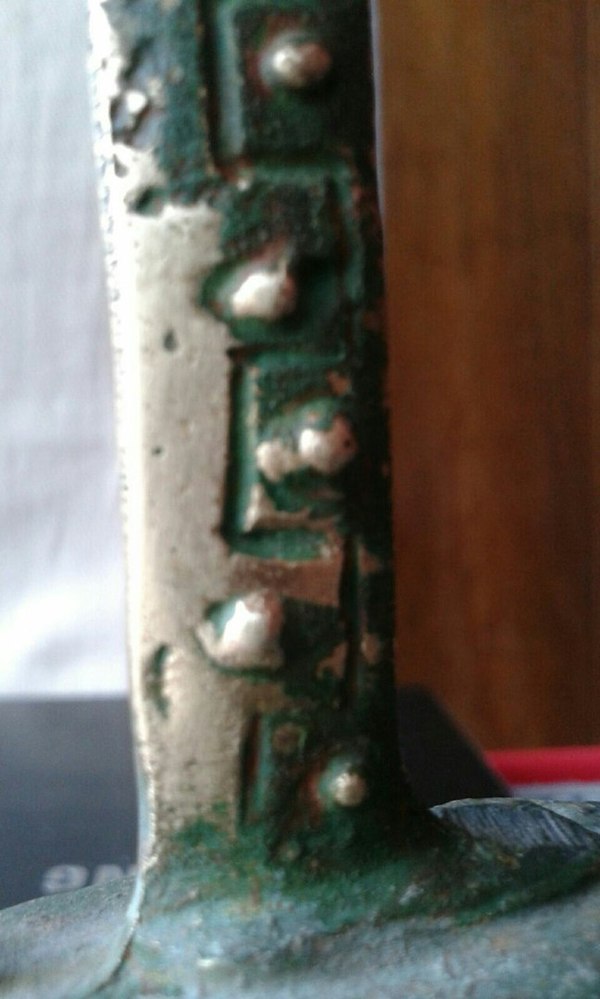 Размер 15-20 см, вес под 200-250 гр. Копьё, судя по всему, выполнено из меди (наконечник отломан) Статуэтка покрыта чем-то зелёным, вроде краски. При очистке под краской проступил желтый металл, похожий на золото. Мама провела какие-то бытовые тесты на проверку - наносила уксус и йод, пятен не осталось и это, вроде как, говорит о том, что это именно золото.