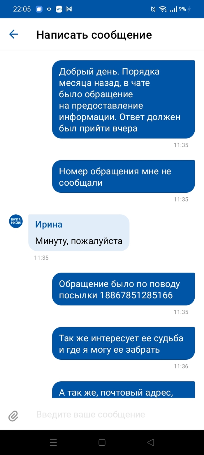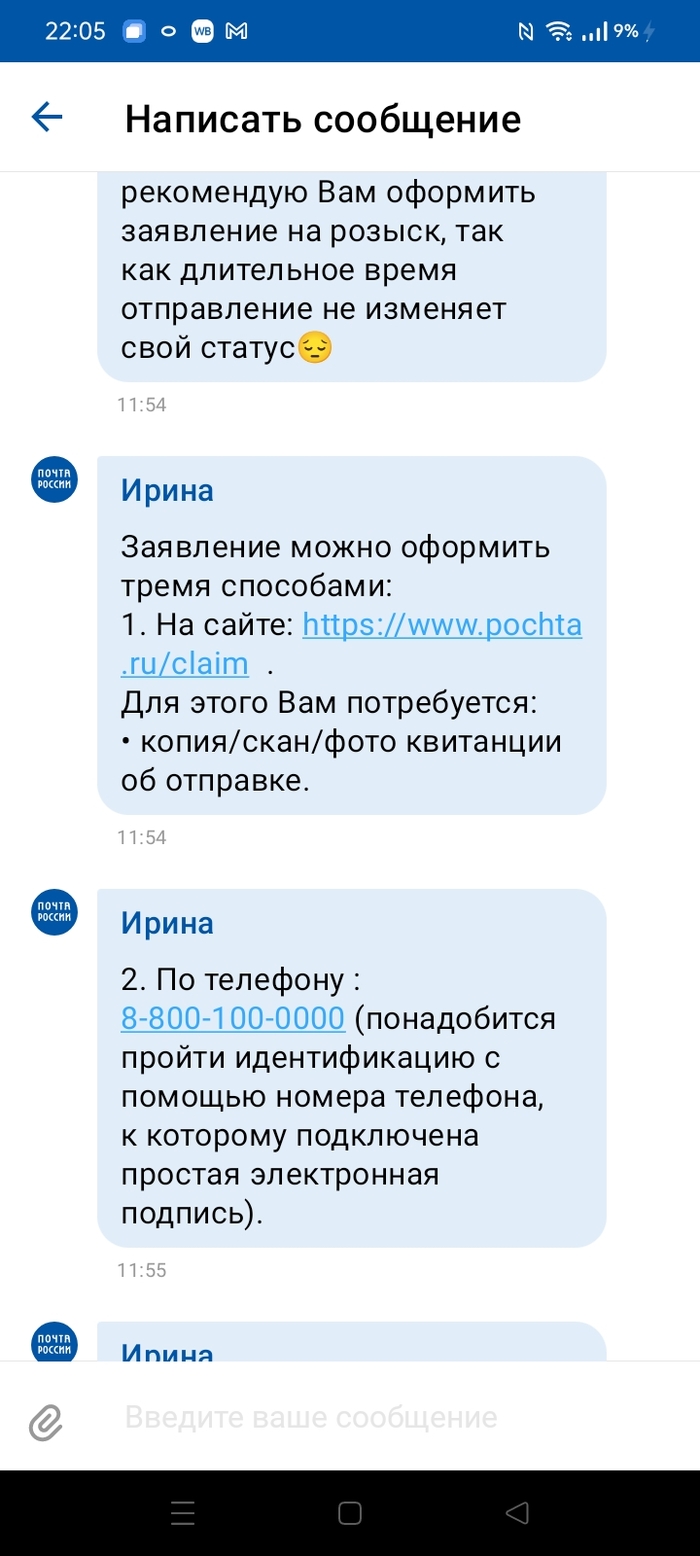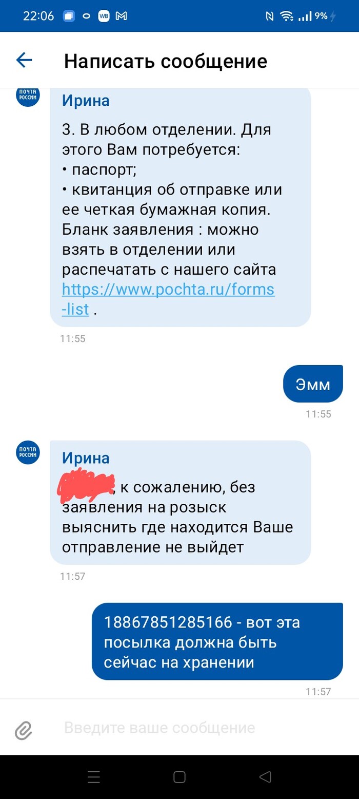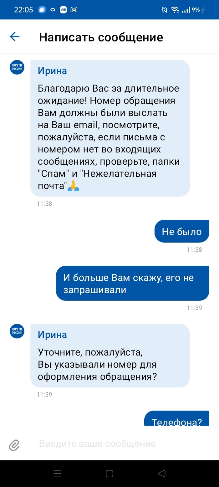 В этот же день моя подруга начала штурмовать поддержку в приложении Почты России, где выясняется, что оказывается, должен быть номер обращения: