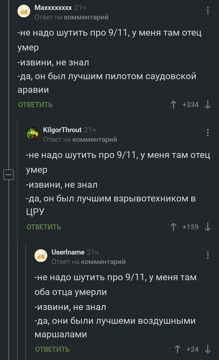 23 MUSLIII Скриншоты комментов Юмор 3 причины не шутить о 9/11 5 лет назад #comment_176981522 @Maxxxxxxxx, @KilgorThrout, @Userlname, вы в телевизоре. Показать полностью 1 Скриншот Черный юмор Авиакатастрофа Ещё 0