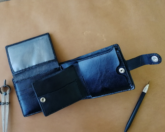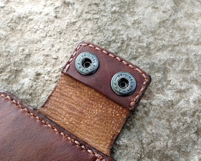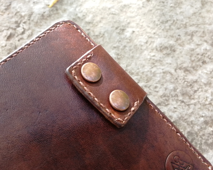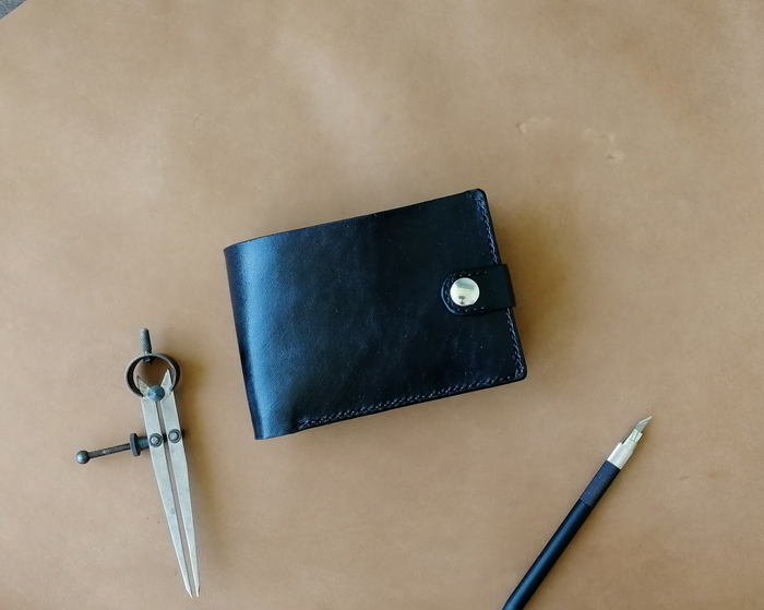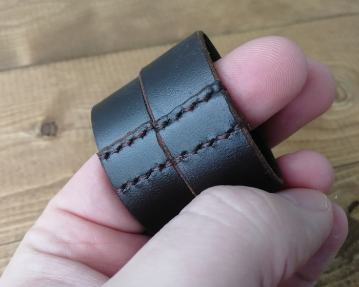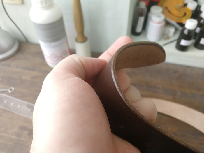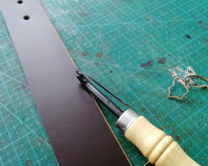Теперь вооружившись кромкорезом нужно снять фаску с всего периметра заготовки и отполировать торец. Я предварительно подкрасил торец проникающей тёмно-коричневой краской, и заполировпл торец с помощью токоноле. По итогу на коже растительного дубления получаем гладкий торец. На хромовой коже можно ещё воспользоваться краской для торцов или воском.