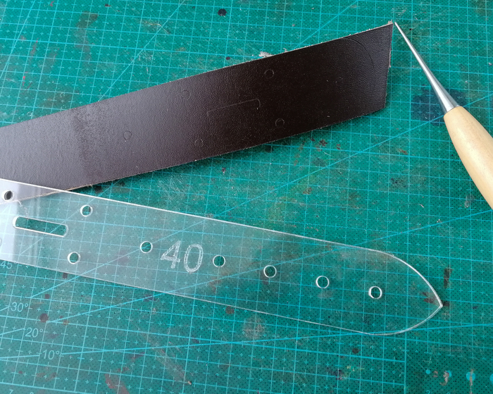 Первым делом следует сделать разметку под все отверстия. Удобнее делать это по шаблону, но можно воспользоваться бумажными распечатками подобных шаблонов из интернета. После обрезаем все по разметке и пробиваем отверстия по винты и язычок пряжки.