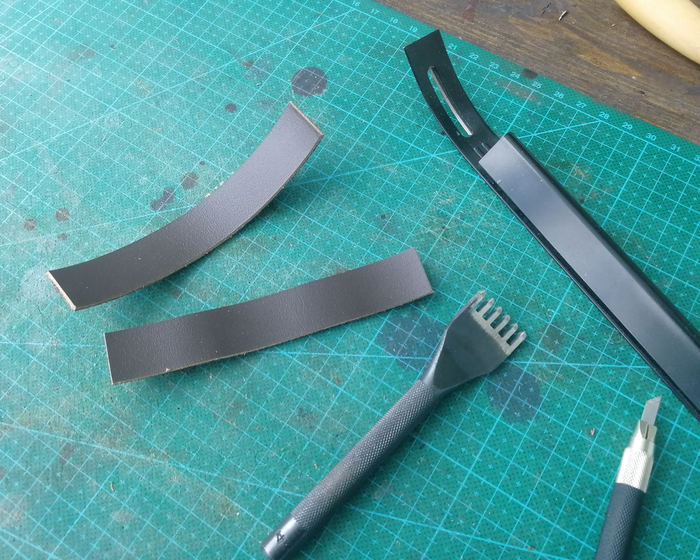 Фурнитуру и инструмент, который будет использоваться можете увидеть на фото выше(ременной шаблон почти не видно за заготовкой, но он там есть:)) отвёртка под винты и линейка есть у всех как мне кажется.