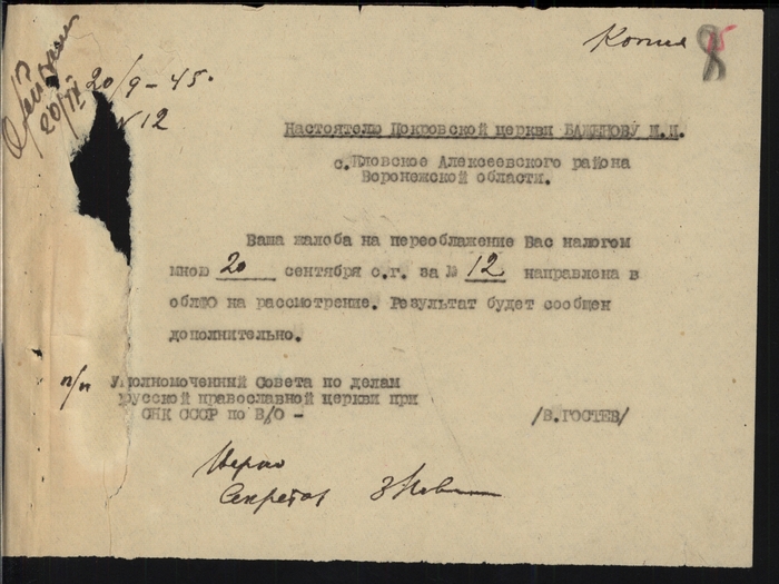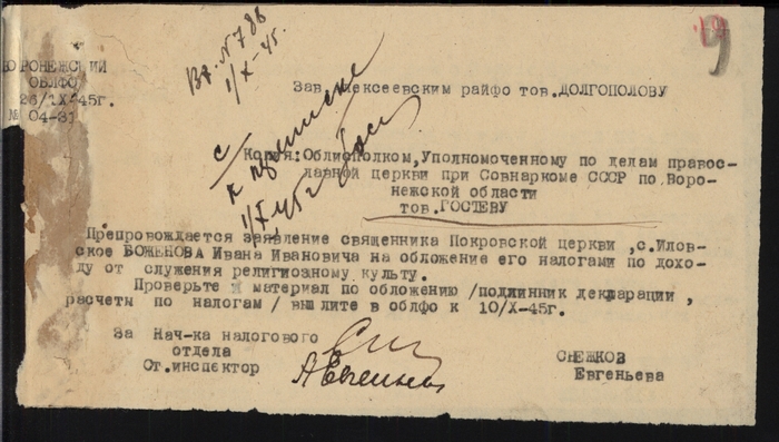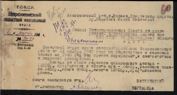 "Зав. Алексеевским райфо тов. Долгополовукопия: Облисполком, Уполномоченному по делам православной церкви при Совнаркоме СССР по Воронежской области тов.ГостевуПрепровождается заявление священника Покровской церкви, с.Иловское Боженова Ивана Ивановича на обложение его налогами по доходу от служения религиозному культу.Проверьте материал по обложению (подлинник декларации, расчеты по налогам) вышлите в облфо к 10.10.45г.Зам Нач-ка налогового отдела СнежковОт. инспектор Евгеньева."Ну и финал истории: