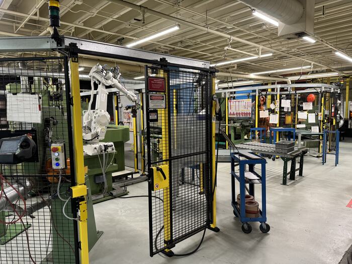 На заводе несколько цехов и каждый, соответсвенно, выполняет свою работу. Наш цех делает заготовки ножей (это я, собственно), последующую обработку заготовок, шлифовку, фрезеровку, сверление, серейторную заточку, торцевание и пр. В общем, всю черновую работу перед закаливанием. Это наш цех и наши роботы: