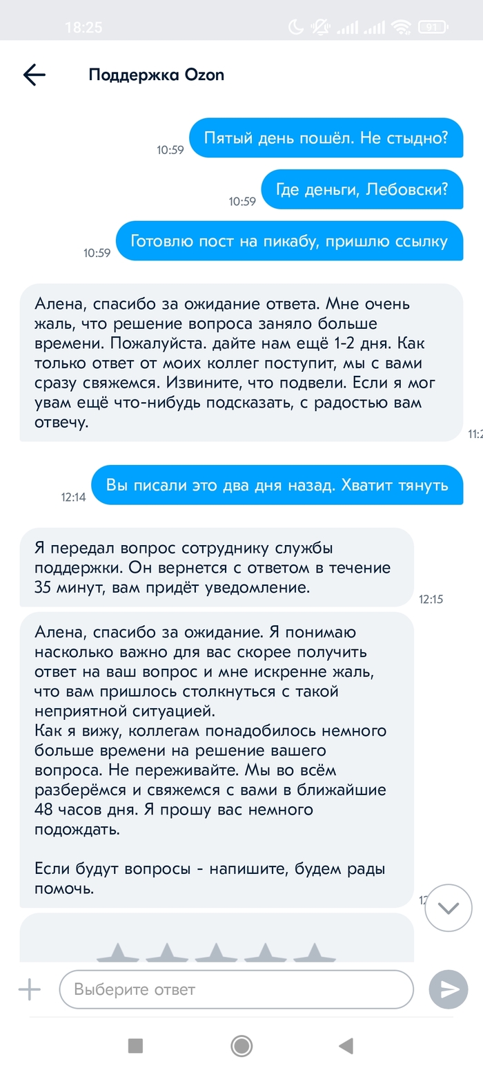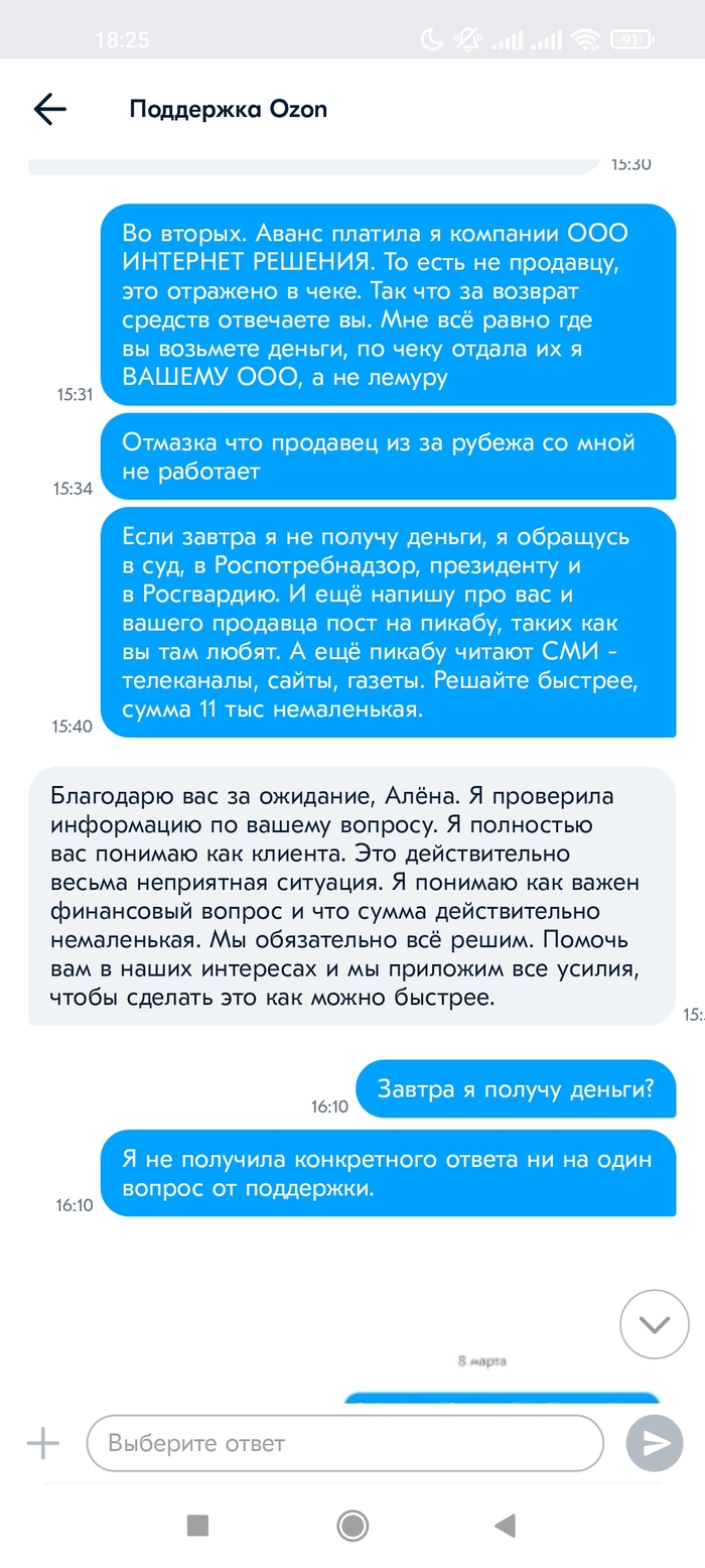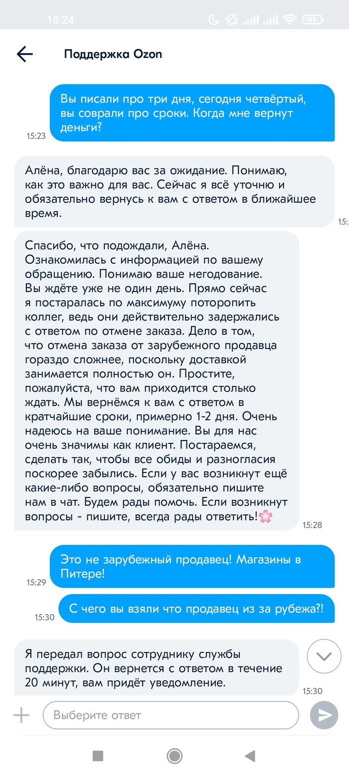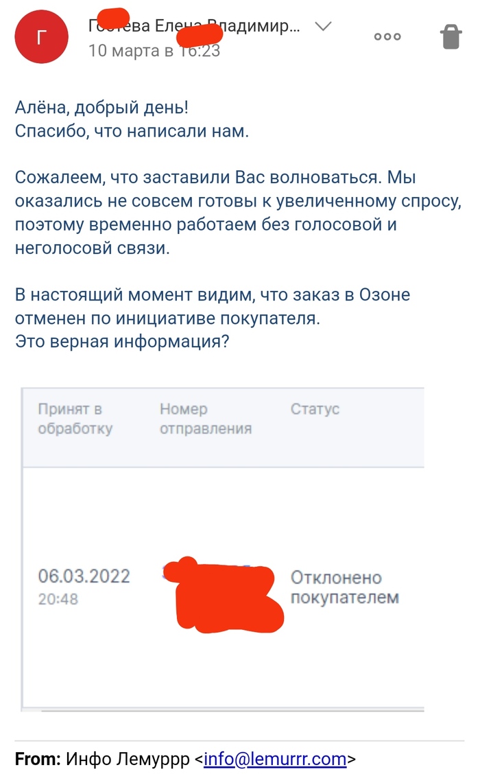 Решила позвонить напрямую в лемур, узнать, что с заказом. Но после робота на горячей линии звонок сбрасывают! Телефоны магазина не отвечают или не обслуживаются! У меня паника, мол мошенники отжали бабло... Как так, я же осторожна, и это же Озон! Что может случиться?!
