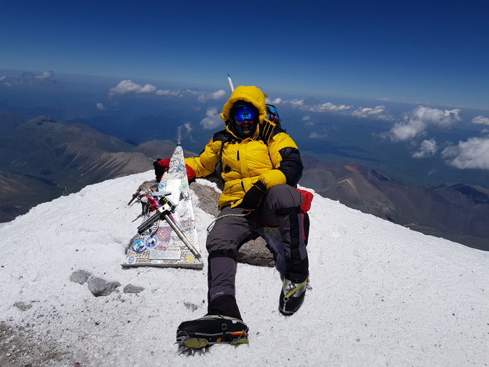 После отдыха мы медленно поползли вверх. Тут я воспользовался методом, который выработал еще при подъеме на скалы Пастухова - вообще не смотреть вверх, смотреть только на ноги впередиидущего и просто шажок за шажком. Это адище продолжалось около двух с половиной часов. Но, что забавно, я уже не особо парился по поводу нехватки кислорода. Разумеется, тут дело не в физической адаптации, а скорее в психологической. Мысли развернуться и уйти меня уже не посещали. Когда перила закончились, мы остановились на привал. Впереди был еще небольшой подъем, метров пятнадцать, а что за ним, видно не было. После привала пошли дальше. Забрались на подъем, а там большое плато, в конце которого небольшой холмик, который и был вершиной. Нашей радости не было предела. Все ломанули к холму и ... моментально сдохли. Мы кое как подползли к подножью вершины и устроили еще один мини привал, чтоб хоть как-то отдышаться. Холмик оказался не такой уж и маленький - метров десять в высоту. Пожалуй, это были для меня самые сложные десять метров. Знаете, какая первая мысль посетила мою голову, когда я взобрался на вершину? "Капец! Как же я устал!". Но очень быстро ее сменила другая - "Твою мать, это ж надо будет еще назад переться через весь этот булыжник-переросток". И все. Ни радости покорения вершины, ни осознания достижения цели, ни ощущения того, как нефигово подросло моё чсв. К тому же формально это еще не считалось восхождением. Да, я сделал фотку на вершине, но эту фотку еще нужно было доставить вниз в целости и сохранности.