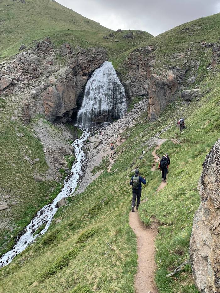 На следующий день мы выходили на водопад Девичьи Косы и в обсерваторию. Вот тут все было намного веселее. Было довольно много пологих участков, а природа вокруг была еще красивее. Поскольку этот маршрут уже шел непосредственно по склону Эльбруса, то здесь мы впервые увидели тех самых безбашенных ребят, которые восходят на гору с самых низов. Жара дикая, а они идут в теплых тяжеленных двойных ботинках с огроменными рюкзаками за спиной. Я таких рюкзаков раньше вообще не видел. Ну реально, они по размеру, наверное, чуть меньше моего самомнения. Я их порасспрашивал, говорят, что планируют добраться до вершины за 3–4 дня. Капец! От обсерватории нам опять открылся шикарный вид на гору нашего назначения, которую опять не было видно из-за облаков. У нас уже начали распространяться сомнения, а точно ли Эльбрус существует. А то вот так приведут нас куда-то, скажут, что это вершина Эльбруса, и вот как ты это проверишь? :)