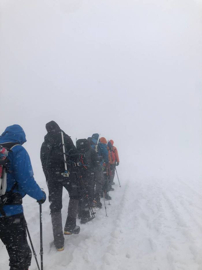 Не успели мы выступить на косую полку, как один из наших сокомандников начал харкать кровью. Поскольку ратрак уже уехал, один из гидов пошел с этим чуваком спускаться к скалам Пастухова, куда можно было вызвать снегоход. Вот так, еще не успев начать, мы уже остались всего с двумя гидами. Как бы там ни было, мы выдвинулись в сторону вершины. На пятитысячной высоте с воздухом вообще беда. C самого начала пути я постоянно чувствовал его нехватку. Через балаклаву надышаться было вообще невозможно. Дышал открытым ртом. Благо повезло с погодой. Ветер хоть и был довольно сильный, но метели не было и мне не пришлось идти с полным ртом снега.