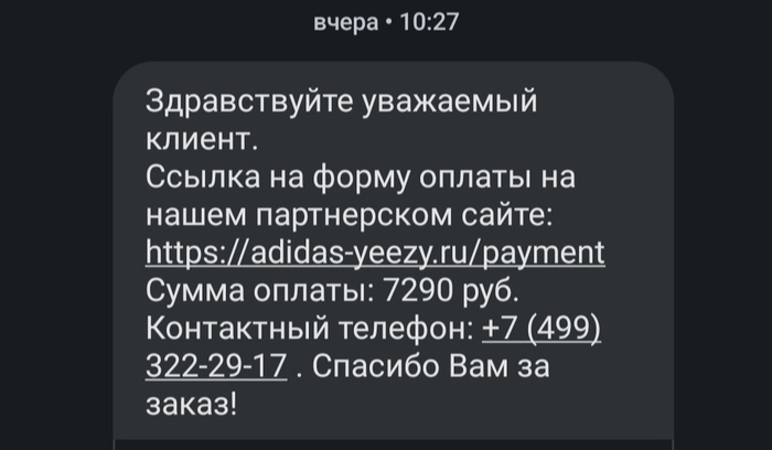 Нашел сайт, на автомате выбрал модельку, оформил заказ. Минут через 15 позвонили, согласовали доставку СДЭК'ом, взяли данные и предупредили что придет смс с ссылкой на оплату с другого сайта-партнера. 1-й звоночек, но сайт партнер - тоже обувной, якобы Adidas.