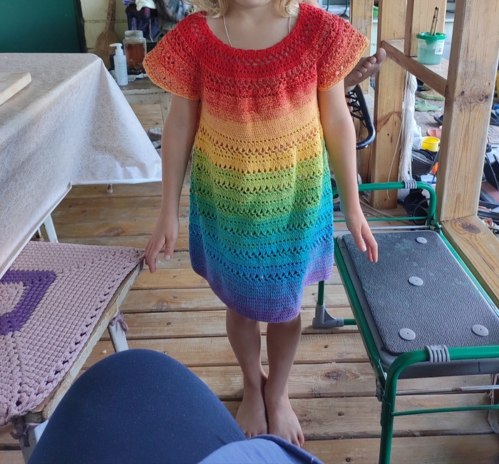 Я не знаю когда мне это надоест, но пока мелкой нравится носить подобное, а мне создавать (для меня это магия когда из нитки получается вещь) я тихонько сижу в углу и превращаю километры нити в разные симпатичные штуки.