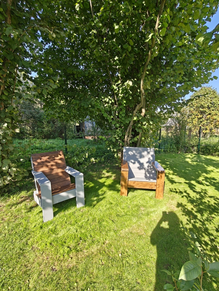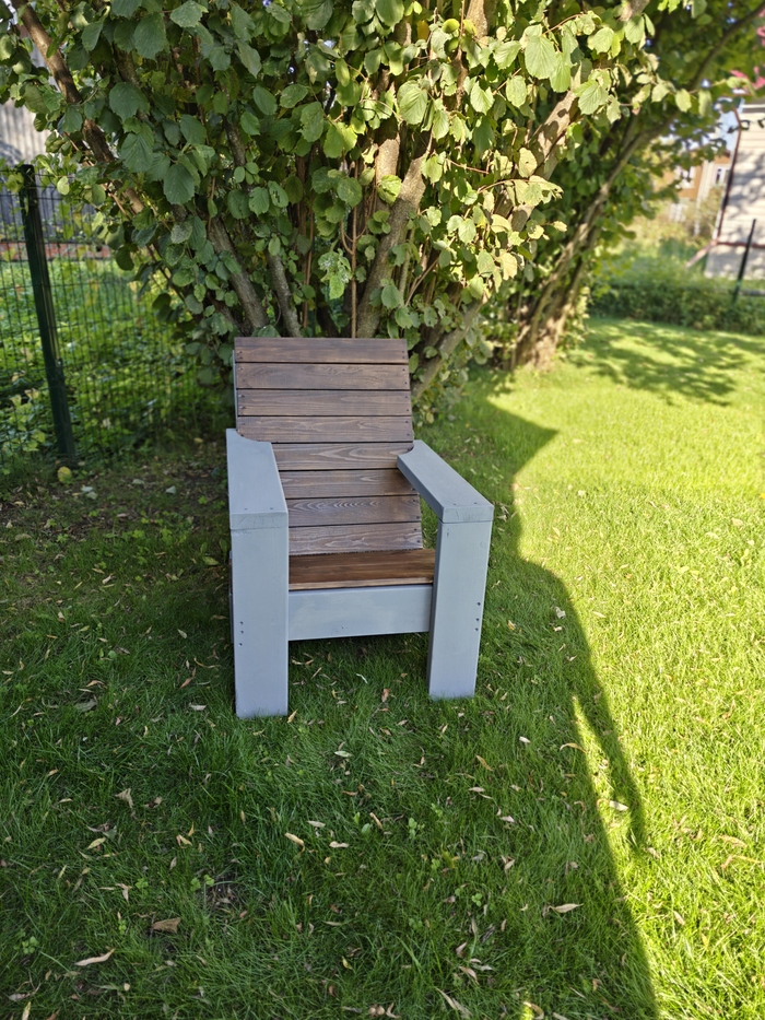 Криво некоторые детали получились, но садовая мебель это прощает, сидеть удобно, чашку чая удобно поставить на подлокотник. Делитесь своими поделками, пикабушники.