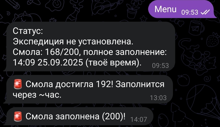 Цели - не продолбать экспедиции и потратить смолу, пока не заполнилось.