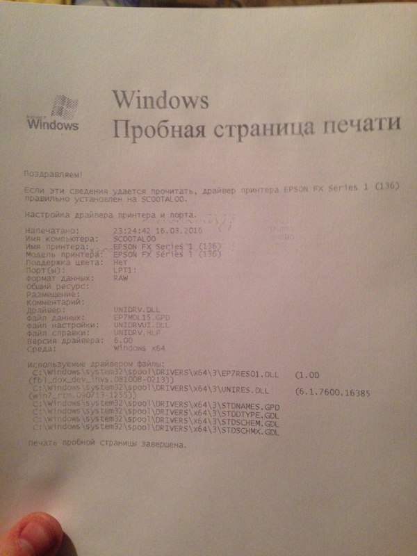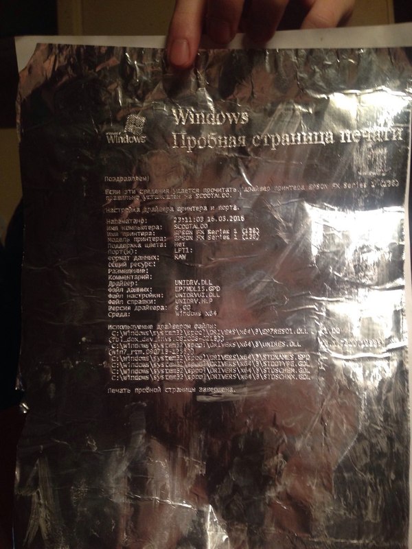 К счастью, путём проб, ошибок, и прямой записи ASCII кодов в порт, был найден совместимый с ним драйвер; после чего принтер показал нам белый лист бумаги, чему виной засохший картридж.