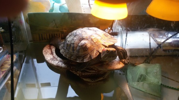Аквариума у нас конечно не было и пару дней она жила в этой канистре, В тот же вечер мы кинули клич в вк, и нам отдали аквариум совершенно бесплатно. Здесь уже где то через месяц с набитым животиком под теплой лампой. Извините за фото не могу развернуть :)