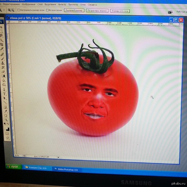 MakScott Обама помидор 11 лет назад На уроках информатики мы работаем с программой Adobe Photoshop. Цель урока: поместить лицо человека на фрукт. Я решил скреативить. Учитель одобрил и 5 поставила [моё] Барак Обама Санкции США Фотожаба Политика