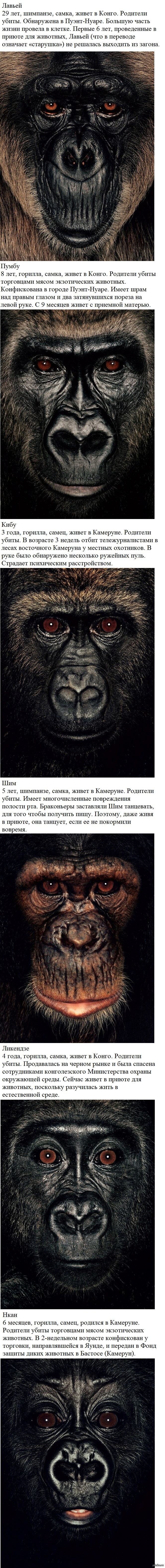 Старшей из этих обезьян 29 лет,младшей 6 мес.Практически у каждой из них есть шрамы или пулевые ранения.А еще их объединяет отсутствие родителей,убитых людьми