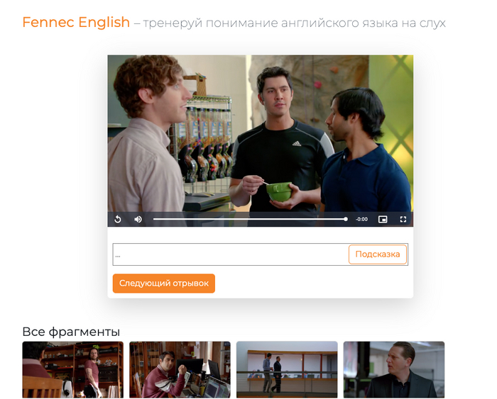 Я создаю Fennec.team. Сервис, позволяющий прокачать понимание английского языка на слух. Сам процесс очень простой. Заходите на сайт, выбираете краткий отрывок из сериала (в данный момент есть только Кремниевая долина первый эпизод), слушаете что говорят герои и вводите это в специальное текстовое поле.