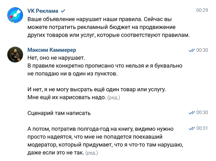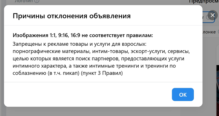 Потом докопались до жаргонизмов - в одном из объявлений была музыка и там было какое-то слово... Чёрт его знает. Просто поищите какие слова разрешены в рекламе ВK - это уморительно.)