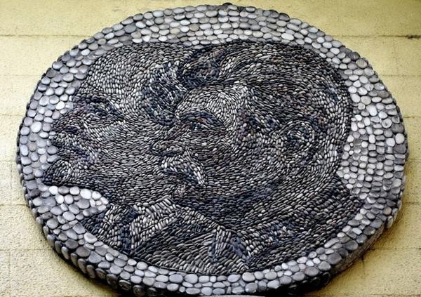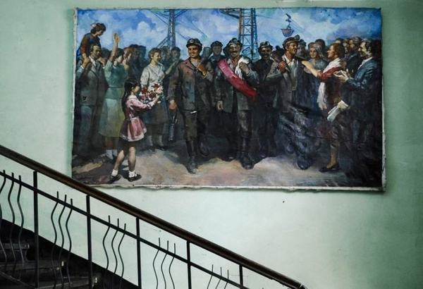 У входа на станцию можно увидеть мозаику с изображениями Ленина и Сталина, сделанную из камней.