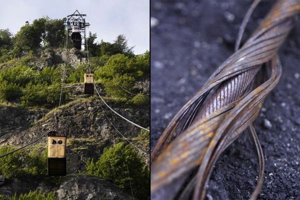 Слева — вагончики канатки с выглядывающими из окон пассажирами, справа — кусок отработанного каната. Кстати, метр такого кабеля весит 12 кг.