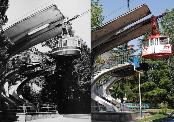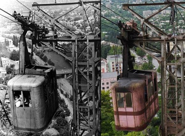 Более современные вагончики: слева — 1960 год, справа — настоящее время. В 2008 году 12 пассажиров повисли в кабине над пропастью, но тормозная система сработала (у этих кабин она есть). Оборудования для спасения людей с высоты в городе Чиатура не было, пришлось дожидаться специалистов из Тбилиси. Так, в течение 12 часов пассажиры висели над городом.
