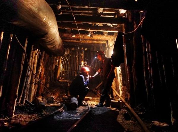 Рабочие в шахте по добыче марганца. После развала СССР шахты были заброшены, и работа возобновилась только в последние несколько лет.