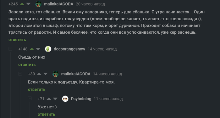 1057 Maligaro 4 года назад Скриншоты комментов Теперь это не его квартира1 #comment_203441661 Скриншот Комментарии на Пикабу Юмор Домашние животные Мат Кот 12 Ещё 0