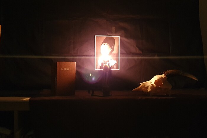 Череп, смотрящий на Библию, Свечку и Портрет, как на символы Знаний, Жизни и Красоты