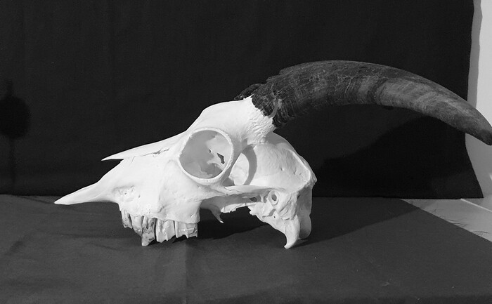 Изначально хотела поставить человеческий череп, но его по очевидным причинам в моей стране не продают. Взяла череп пигмейской козы на Этси. Сделала пару постановок, сфотографировала, потом по фото рисовала картину.
