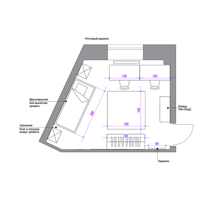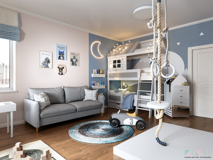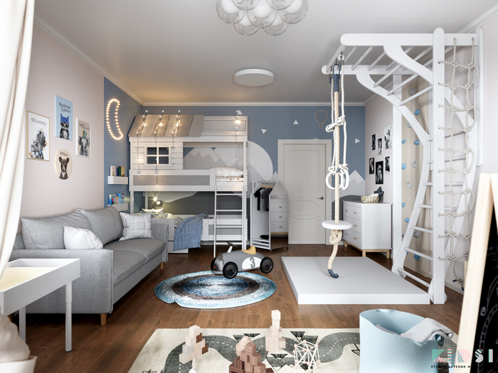 К нам обратились родители 2х погодок школьников 6 и 7 лет. Комната сложной треугольной формы и небольшой площади (всего 13 метров). Нужно разместить все необходимое, но и оставить места для активности и веселья. Ребята- то бодрые. Пока делала замеры, стала свидетелем выяснения, кто просверлил стены внук или дедушка XD